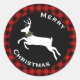 Bison rouge rustique et noir plaqué autocollant de vacances avec un centre cercle noir avec une silhouette de cerf blanc. Joyeux Noël en blanc voûté texte peut être personnalisé pour répondre à vos besoins. Des produits de vacances correspondants sont disponibles.