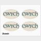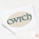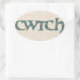 Envoyez un message gallois à vos proches ! Une feuille d'autocollants ovale avec le mot gallois 'cwtch', signifiant 'caquette' ou 'câlin' dans un script celtique, remplie d'un motif Paisley sur un arrière - plan à effet lin.