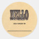 Sur un arrière - plan de parchemin jaunâtre, ce graphique "Hello" est rempli d'une photo originale d'un revêtement patiné en bois, pour un effet vintage Old-West. La conception est optimisée pour cette forme autocollante. Si vous choisissez une autre forme, vérifiez l'effet dans l'écran d'aperçu artistique. Tout devrait tenir à l'intérieur des lignes rouges pointillées.