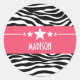 Sassy Star Zebra Stickers tendance et moderne avec un arrière - plan d'impression zèbre noir et blanc chic et une bordure magenta audacieuse ornée d'un motif étoilé amusant. Ce design girly peut être customisé avec le texte personnalisé de votre choix. Cliquez sur "Customiser" pour trouver d'autres options de personnalisation.