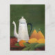 A fine art postcard with the painting in the Naïve or Primitive manner by Henri Rousseau (1844-1910), Still Life with Teapot and Fruit (1910). A white teapot with pears, oranges and lemons on a table with a dark green background. He was ridiculed during his lifetime but later recognized for his paintings. Rousseau was a self-taught French artist.