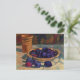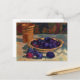 A fine art postcard with the painting by Theo van Rysselberghe (1862-1926), Still Life with Plums (1926). A Belgian Neo-Impressionist painter. A bowl full of purple plums on a table.