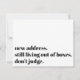 In this tongue-in-cheek card, a bold font was used to render "new address. still living out of boxes. don't judge." on the front. Updated details, along with a friendly "Stay in Touch!" appear on the back. All fonts, colours, and text can be changed to suit your own needs.