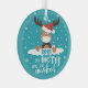 Celebrate and commemorate this pandemic 2021 Christmas with this fun ornament with a lovely cartoon reindeer with a red hat, face mask, and hand sanitizer, decorated with snowflakes. The caption reads "still merry and still masked".