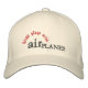 Fits well due to elastic edging, not adjustable. Good qualty material. Good quality embroidering. Subtle lettering (white on beige) just as my wife likes.