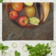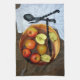 Stillleben mit Äpfel, Holzteller, Tuch und alten Eisen Besteck