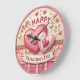 This charming round wall clock features a whimsical 3D-style digital illustration with a cozy, handcrafted aesthetic. The design showcases two large, layered hearts made of pink quilted fabric and striped patterns, complete with decorative buttons and delicate stitching details. The word "HAPPY" is displayed in raised red lettering at the top, while a flowing parchment banner at the bottom carries the elegant message "Valentine's Day." The background consists of rustic white wooden planks adorned with small floating pink hearts and delicate floral vine accents. The perimeter is finished with a soft pink frame, and a pink-and-white plaid pattern decorates the lower section. This functional home accessory is a perfect gift for Valentine Day or anniversaries, adding a touch of shabby chic romance to any bedroom, kitchen, or living space.