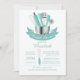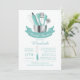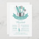 stock moderne l'invitation à la douche nuptiale de la cuisine avec un bol de mélange rempli d'outils de cuisine accentué d'une bannière moderne turquoise bleue et placé sur un arrière - plan blanc contemporain. Visitez notre boutique pour voir notre invitation de wedding shower élégant en différentes couleurs mariages.