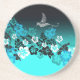 Here's an explosion of tropical flowers on a fade-to-black turquoise background. The design includes a single stylized metallic hummingbird.