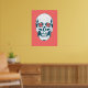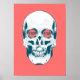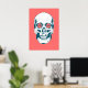 This is a surreal and thought-provoking image featuring a human skull in a dramatic asphalt-grey tone, with two bright yellow stop signs covering its eye sockets. The stop signs are being held up by the outstretched arms of two small figures emerging from within the skull, adding a sense of eerie symbolism. The coral-coloured background creates a striking contrast, enhancing the boldness of the skull and the vibrancy of the stop signs. The artwork evokes themes of boundaries, warnings, or halting thought processes, all while presenting a visually compelling balance of warmth and starkness.