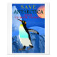 This poster features a cool global warming Save Antarctica Stop Climate Change themed design with full Antarctic full moon, Emperor penguin and frozen glaciers landscape.