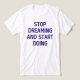 Turn ambition into action with this bold t-shirt featuring the motivational phrase "Stop Dreaming And Start Doing." Perfect for go-getters and those ready to chase their goals, this design encourages you to turn your visions into reality. With dynamic typography and a sleek, modern look, this tee serves as a constant reminder to take charge and make things happen. Whether you're striving for personal or professional success, this shirt will inspire you to take the next step and start doing.