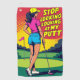 This vibrant pop art image humorously depicts a female golfer on a putting green, with the bold and cheeky caption "Stop Looking at My Putt." The artwork features bright colours and dynamic comic-style graphics, capturing a playful and confident moment in a stylized golfing scene.
