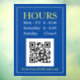 Store Hours Open Sign with QR code for store entry door or window in white and yellow text on dark blue background with QR code message.