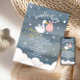 A baby shower invitation featuring a dark blue watercolor inspired background with white text surrounded by stars and illustrations of white clouds and a stork with pink bundle. Personalize with details of your occasion.