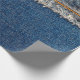 Straight stitch with orange thread on bleached denim fabric with fringe edge, on blue denim background, text place, copy space. Denim blue jeans fabric frame. Worn Jeans Casual Double Colour patch