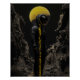 An astronaut stands in a rugged, rocky landscape illuminated by a glowing yellow line running down the front of their suit. Behind the figure, a large, yellow celestial body casts a dramatic contrast against the dark background.