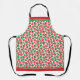 Strawberries apron designed with a multi-directional pattern of illustrated strawberries, and red and green stripes along the top and bottom edges. This strawberry apron is perfect for anyone who loves strawberries and cute summer fruit designs.