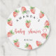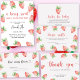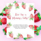 Cute baby shower invitation card featuring watercolor illustration of strawberries. The text says "berry much for coming" Matching items available.