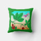 Throw pillow in a digital illustration of ripe strawberries on a branch of emerald green leaves against a soft, orange to turquoise, sunset sky background, visited by a purple winged dragonfly