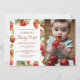 Beautiful cute colourful spring, summer strawberry 1st birthday theme, berry first birthday party photo invitation featuring watercolor illustration of juicy colourful wild strawberries pattern. Please replace the sample photo with your own.