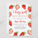 Cute girl's baby shower invitation card featuring watercolor illustration of strawberries. The text says "a berry sweet baby is on the way."
