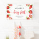 Cute strawberry theme girl's 1st birthday party welcome banner featuring watercolor illustration of the red fruit. The text says "welcome to XX's berry first birthday party."