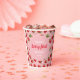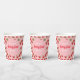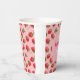 These fun "berry first" birthday paper cups feature a stylish strawberry pattern, red on pink background with contrasting font.