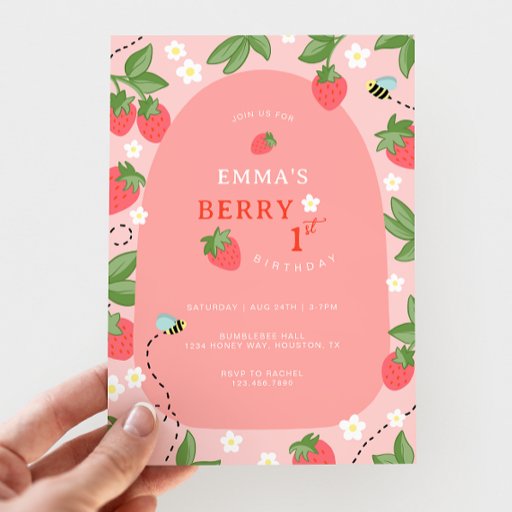The cheerful strawberry design pairs beautifully with berry first birthday and strawberry shortcake party themes, and each card can be customized with your child’s name and message. Whether you’re mailing them out or including them with party favours, these cards add a heartfelt touch to your strawberry birthday celebration.
