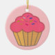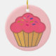 Faux embroidery print cupcake. Custom ceramic ornaments. Pink background version. Decor idea.