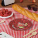 A glass of strawberry daiquiri with garnish. Seamless red background. Custom text.