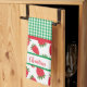 Fun, colourful kitchen towel features a green and white gingham check plaid with a strawberry pattern at the bottom. A faux red ribbon separates the two patterns. At the bottom is a place for you to personalize the towel.