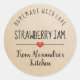 Simple "homemade with love" sticker featuring "strawberry jam" with a black font on a simple white background embellished by a cute red heart. Customize text.