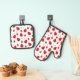 An oven mitt and pot holder set with a pattern of red strawberries on a white background. Get these for your kitchen, today!