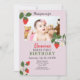 Cute, pink, summer, modern strawberry 1st birthday invitation, with custom photo of the baby girl.