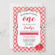 Strawberry Picnic 1st Birthday Invitation, red gingham and strawberry theme.