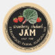 Stylized strawberries and watercolor vintage rhubarb on black with kraft border; date and ingredients