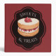 Sweet treats and desserts have a home in this lovely binder for storing your recipes. Design features a red background. On the front cover is a black decorative label overlay with red trim. In the centre of the overlay is a graphic of a sweet and delicious looking strawberry shortcake. Above and below the strawberry shortcake is customizable text in white font that says Sweets & Treats. Along the spine of the binder is customizable text in white font where you can add your name or text.