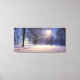Panoramic view of evening winter landscape. View of covered in snow trees in park and street lights in Riga, Latvia