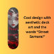 A cool design of a female samurai warrior with red and black colour to make it pop, the words "Street Samurai" I thought was appropriate for the design and board, but you can edit it to change it to whatever you want it to be. Change the text, font type, colour and size, or transfer the design onto another board type. Even upload your own image if you prefer. Generative content.