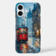 This expressive painting captures a vintage red streetcar moving through a European-style city at dusk. The bold, thick brushstrokes of the impressionist style create a sense of motion, as if the streetcar is gliding along the wet tracks. The cool blues and grays of the sky and surrounding buildings contrast sharply with the glowing warm yellows and oranges from the streetlights and tram windows. The reflections on the wet pavement shimmer with splashes of color, emphasizing the city’s energy and vibrancy. The dynamic brushwork enhances the movement of people in the background, making it feel like a fleeting moment in a busy, urban setting.