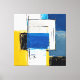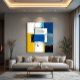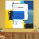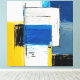 A burst of vibrant colours like yellow, blue, and white, interwoven with black strokes, forms an abstract composition reflecting chaos and balance. Paint layers suggest emotional depth and movement, inviting personal interpretation.