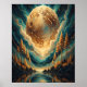 This digital artwork portrays a surreal and enchanting scene, where a massive, textured planet dominates the sky, casting a warm, golden glow over a tranquil forest landscape. The planet, with its intricate surface patterns, appears to be floating above a calm lake, reflecting its light and colours in the water below. Tall pine trees stand on rocky shores, their silhouettes adding depth to the composition. The sky is filled with swirling patterns of teal, gold, and deep blue, creating a sense of movement and energy. The interplay of light and shadow, combined with the reflective surface of the lake, evokes a sense of wonder, peace, and the beauty of the cosmos. This image captures the harmony between nature and the universe, inviting viewers to contemplate the vastness and mystery of the cosmos.