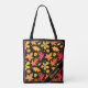 Striking Autumn leaves are gracefully falling to the ground against a black background. The edge has an orange stripe going all the way around. In the lower right corner is a diagonal banner in black with an orange edge, where you personalize with your name in a modern yellow script. Such a beautiful, fun tote bag for the Fall season! Great for quick trips to the farmers market, for overnight trips and more.