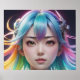A digital character with luminous, multi-coloured hair and mechanized headgear gazes directly at the viewer with striking, large eyes. The background is dark, which emphasizes the vibrant colours of the hair and the futuristic elements of the headgear.