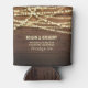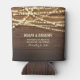 romantic and rustic wedding koozie cooler with string lights and barn wood.