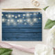 A stylish rustic envelope decorated with pretty string lights on a blue rustic wood background with your names and return address set in chic typography. Designed by Thisisnotme©