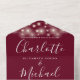 All in one wedding invitation featuring pretty string lights and elegant signature script name and monogram initials on a burgundy background. The invitation includes a perforated RSVP card with your wedding website QR code and details. Designed by Thisisnotme©