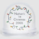 Modern colorful string Christmas lights wreath surrounds your baby's photo on the front and you can personalise with name and year of their first Christmas on reverse.