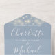 All in one wedding invitation featuring pretty string lights and elegant signature script name and monogram initials on a dusty blue background. The invitation includes a perforated RSVP card with your wedding website QR code and details. Designed by Thisisnotme©